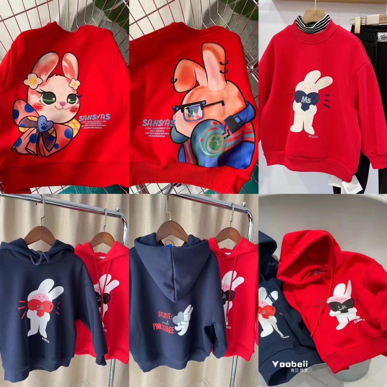 韩国冬季儿童加厚一体绒连帽卫衣男女童羊驼绒宽松帽衫红色新年服