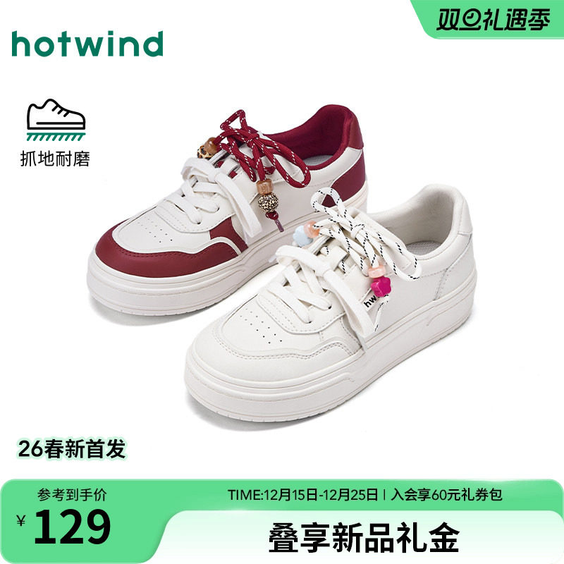 热风百搭休闲鞋女款2026年春季新款平底双鞋带板鞋简约运动女鞋子