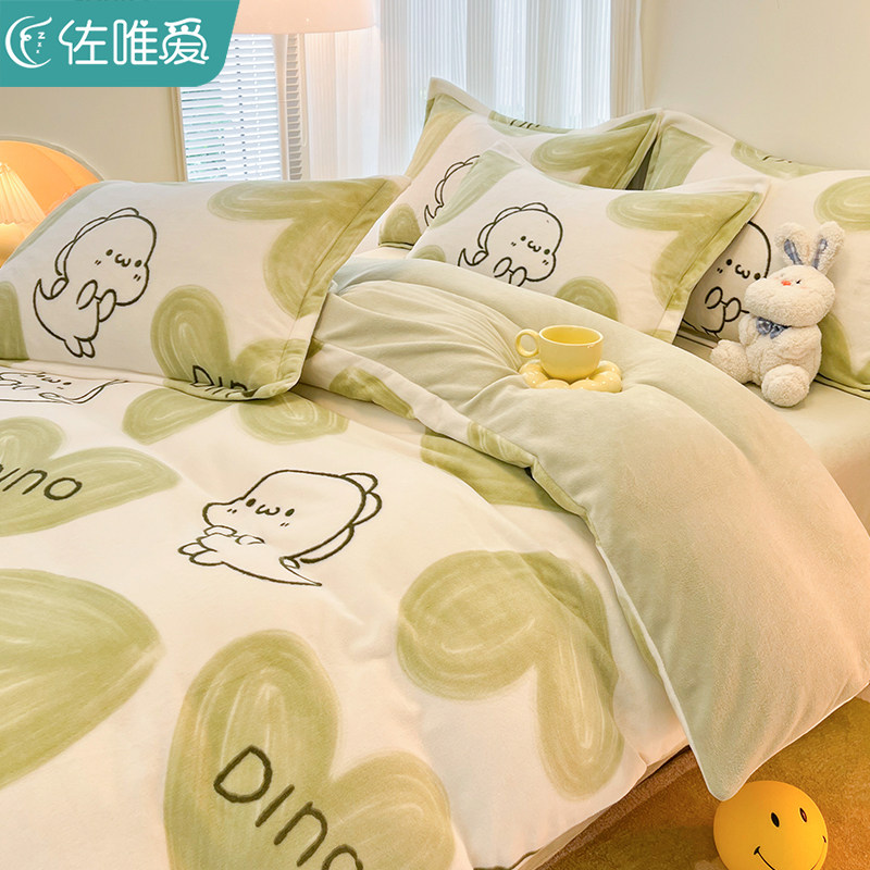 卡通儿童冬季加绒牛奶珊瑚绒被套单件双面床单被罩绿色被单四件套