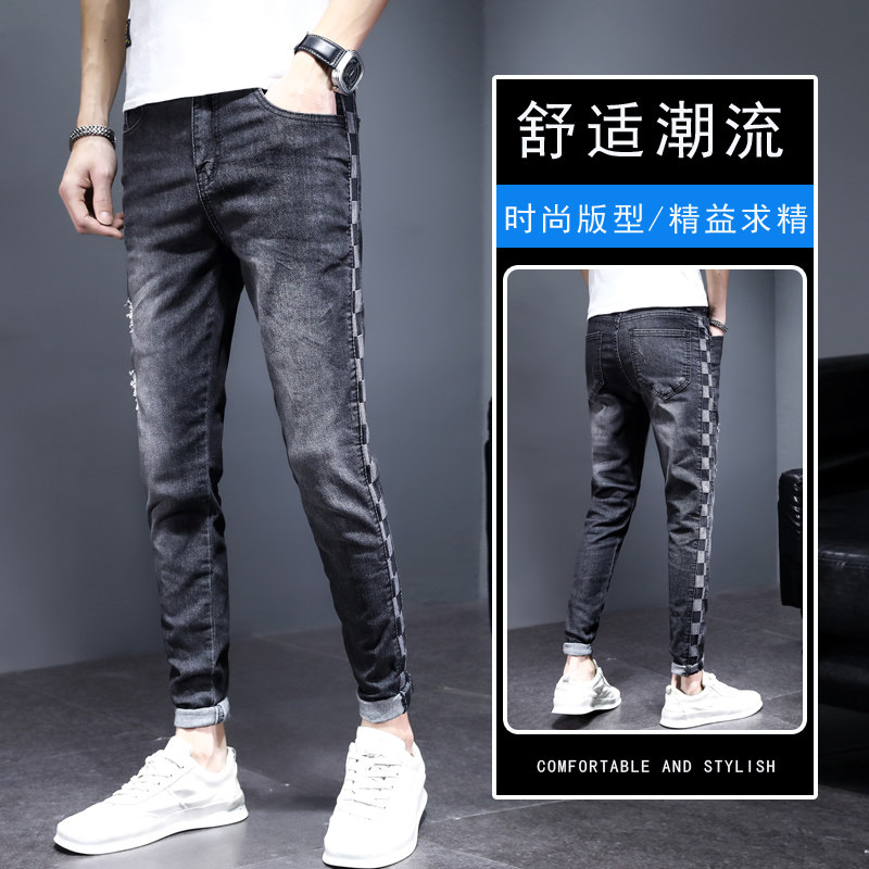 春秋季款男士精神小伙社会装快手红人同款修身型紧身小脚牛仔裤子