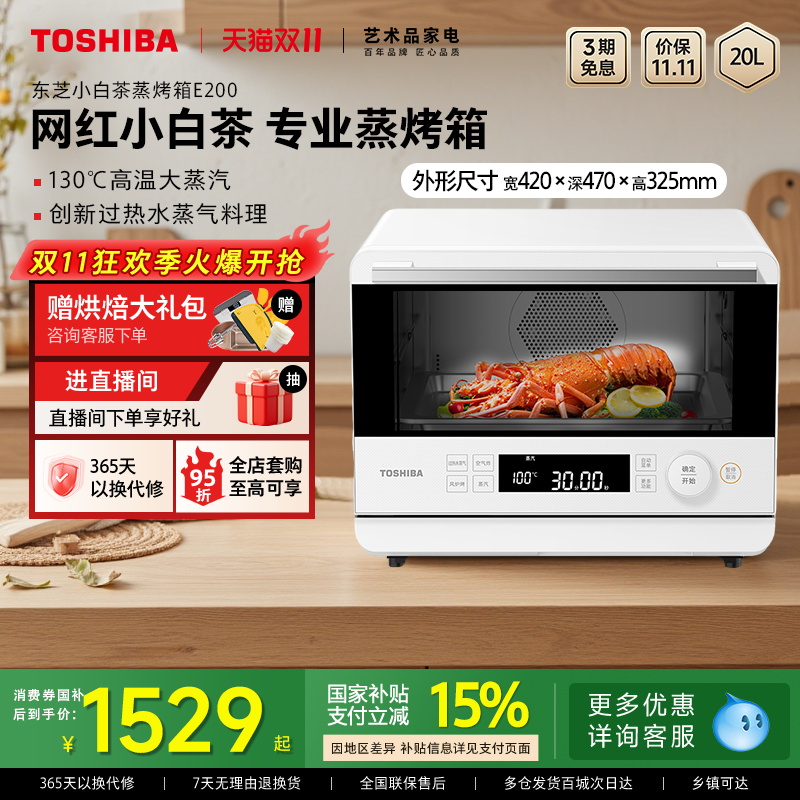 双11预售东芝小白茶蒸烤箱一体家用蒸烤炸E200小烤箱20L大蒸汽