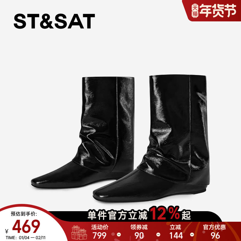 星期六英伦风短靴女2025秋冬方头小个子内增高裤管靴黑色复古皮靴