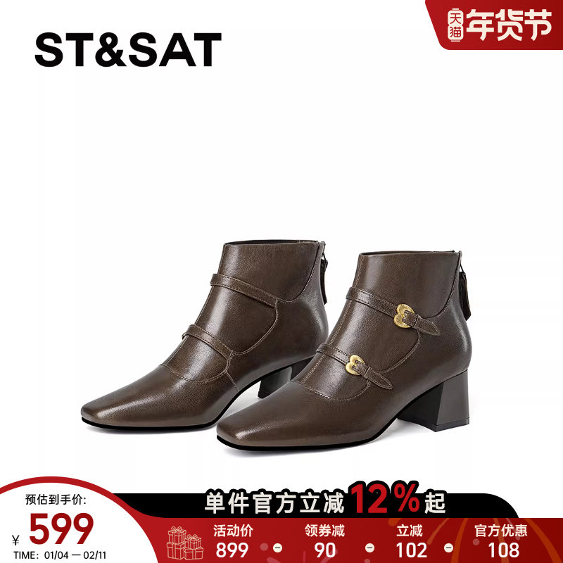 星期六英伦风短靴女2025秋冬真皮复古方头粗跟切尔西靴高跟时装靴