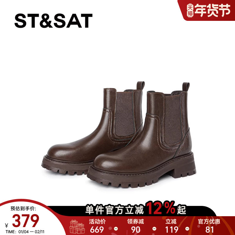 星期六英伦风短靴女2025秋冬厚底粗跟棕色切尔西靴真皮圆头瘦瘦靴