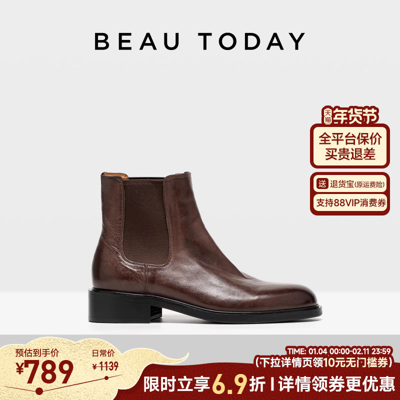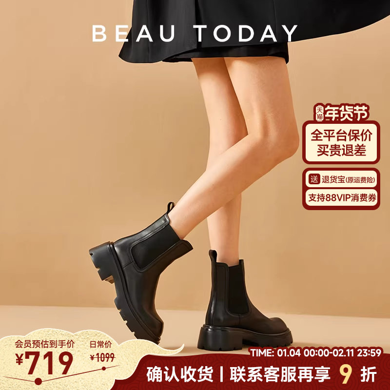 BeauToday真皮切尔西靴女款秋季BT粗跟英伦风短靴女厚底增高靴子