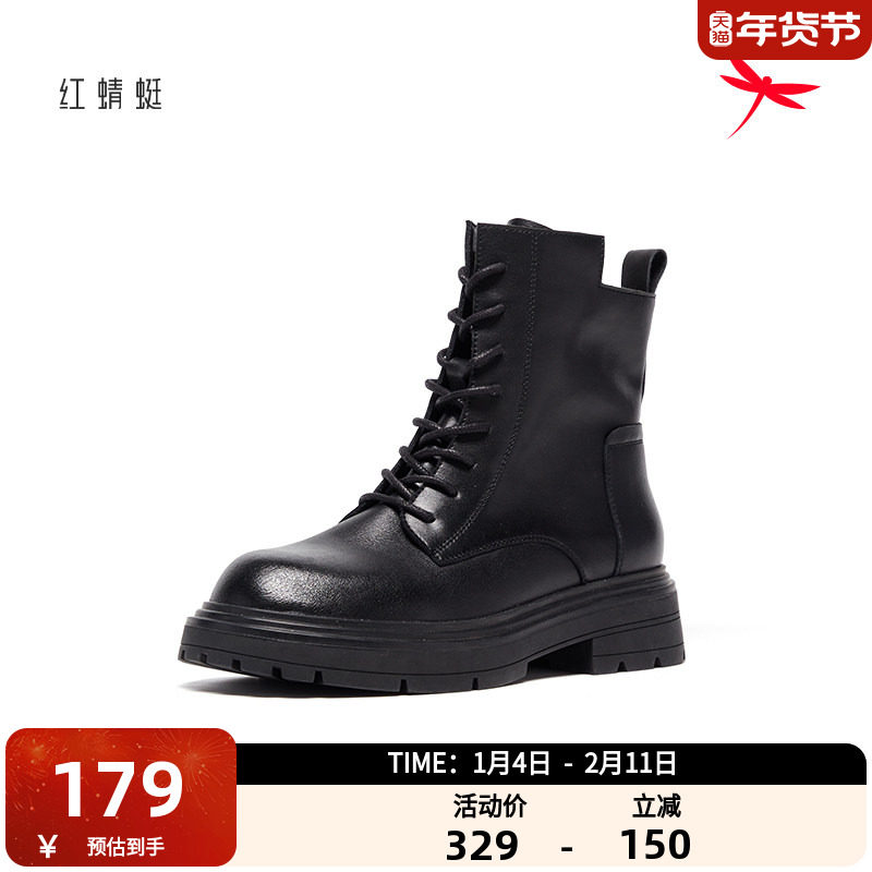 红蜻蜓马丁靴女时尚英伦风短靴女百搭女靴休闲复古加绒机车靴子女