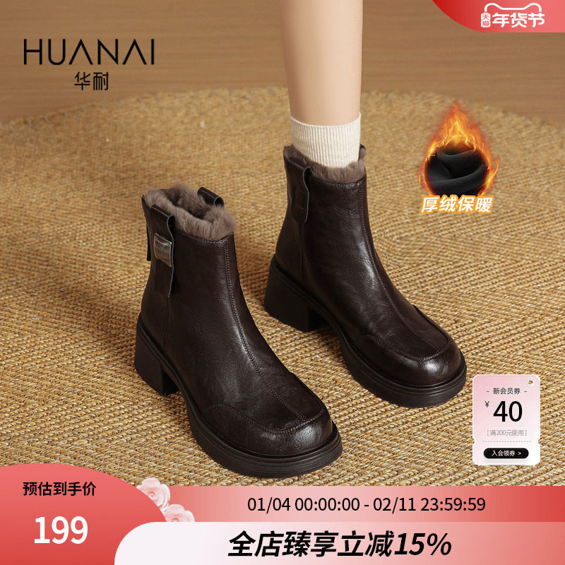 华耐英伦风短靴女加绒2025冬季新款百搭厚底马丁靴保暖雪地靴女靴