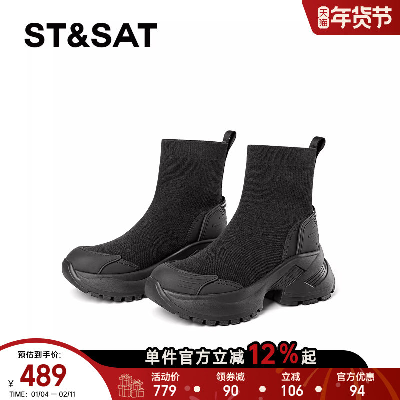 星期六英伦风短靴女2025弹力飞织袜靴真皮运动休闲厚底增高瘦瘦靴