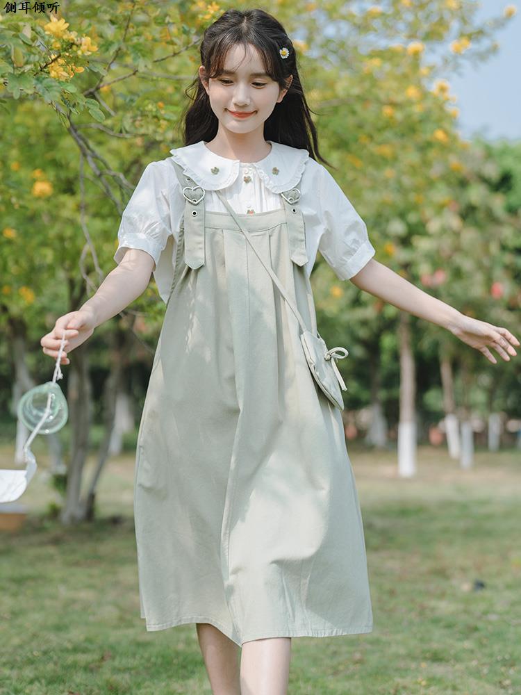 小清新背带连衣裙套装女夏初中高中学生显瘦森系娃娃领短袖两件套