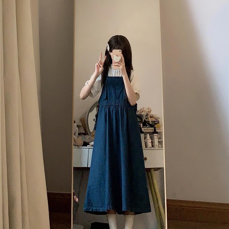 海让路背带牛仔裙女小清新森女系中长款过膝深蓝连衣裙可爱吊带裙