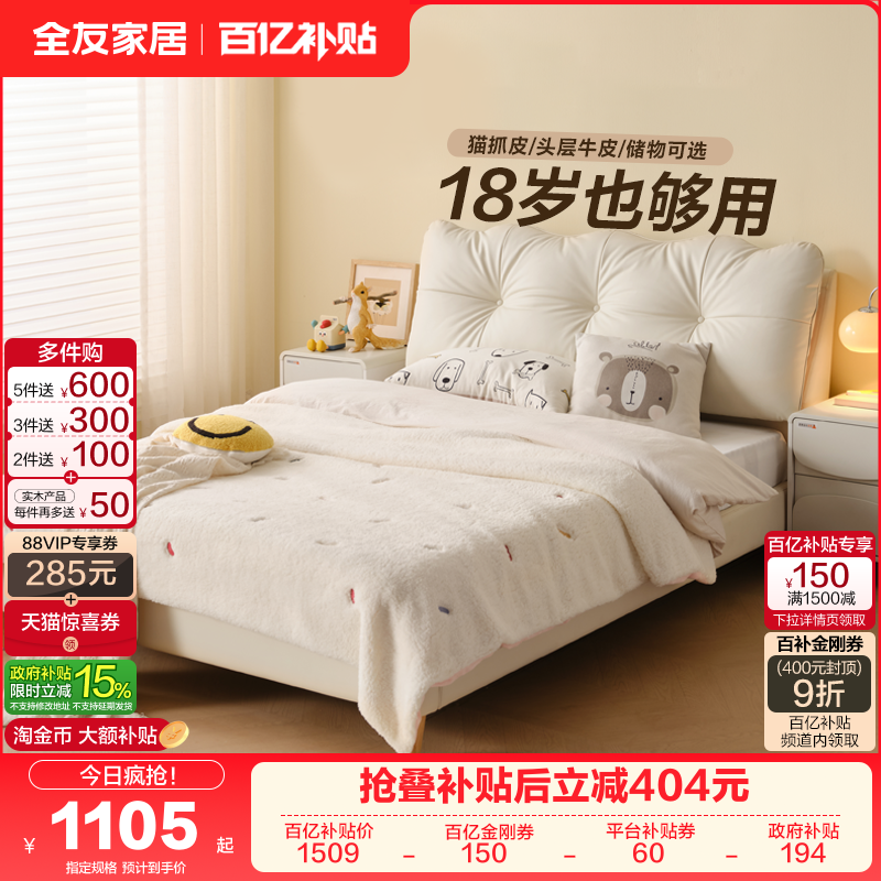全友家居奶油风1米5儿童床男孩储物2025新款1米2单人床女孩公主床