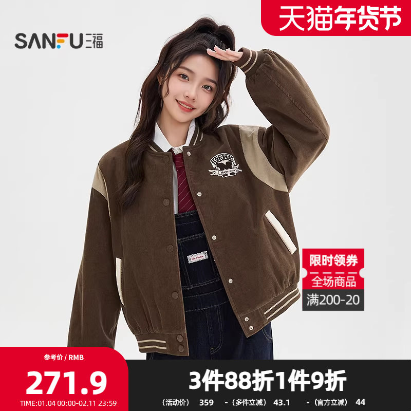 三福灯芯绒加厚外套2025冬季学院风刺绣夹棉棒球服上衣女装513349