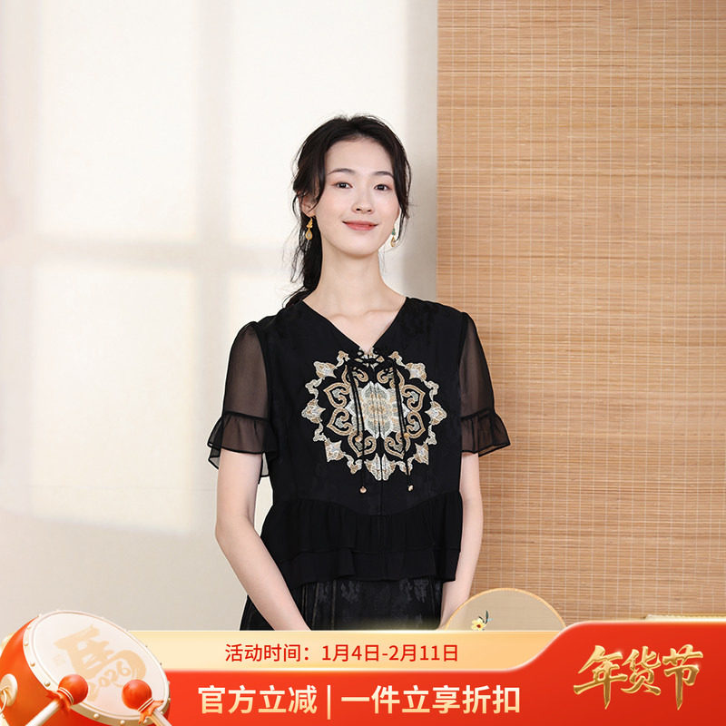 布符2025年夏季新款黑丝绒双层荷叶摆上衣时尚优雅舒适气质短外套