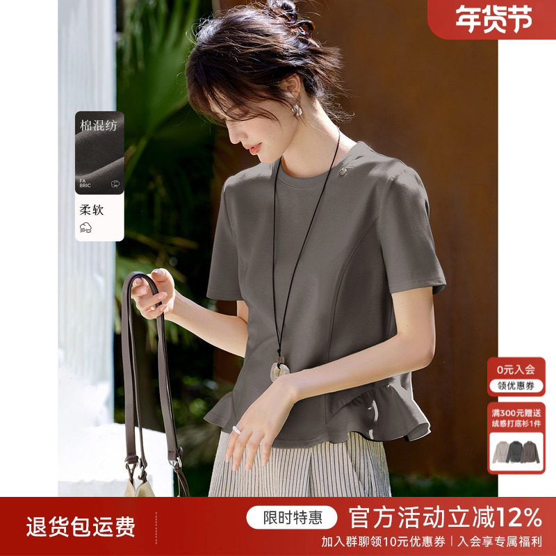 夏日小记 俏皮荷叶边下摆短袖T恤 芭蕾风圆领显瘦百搭收腰上衣