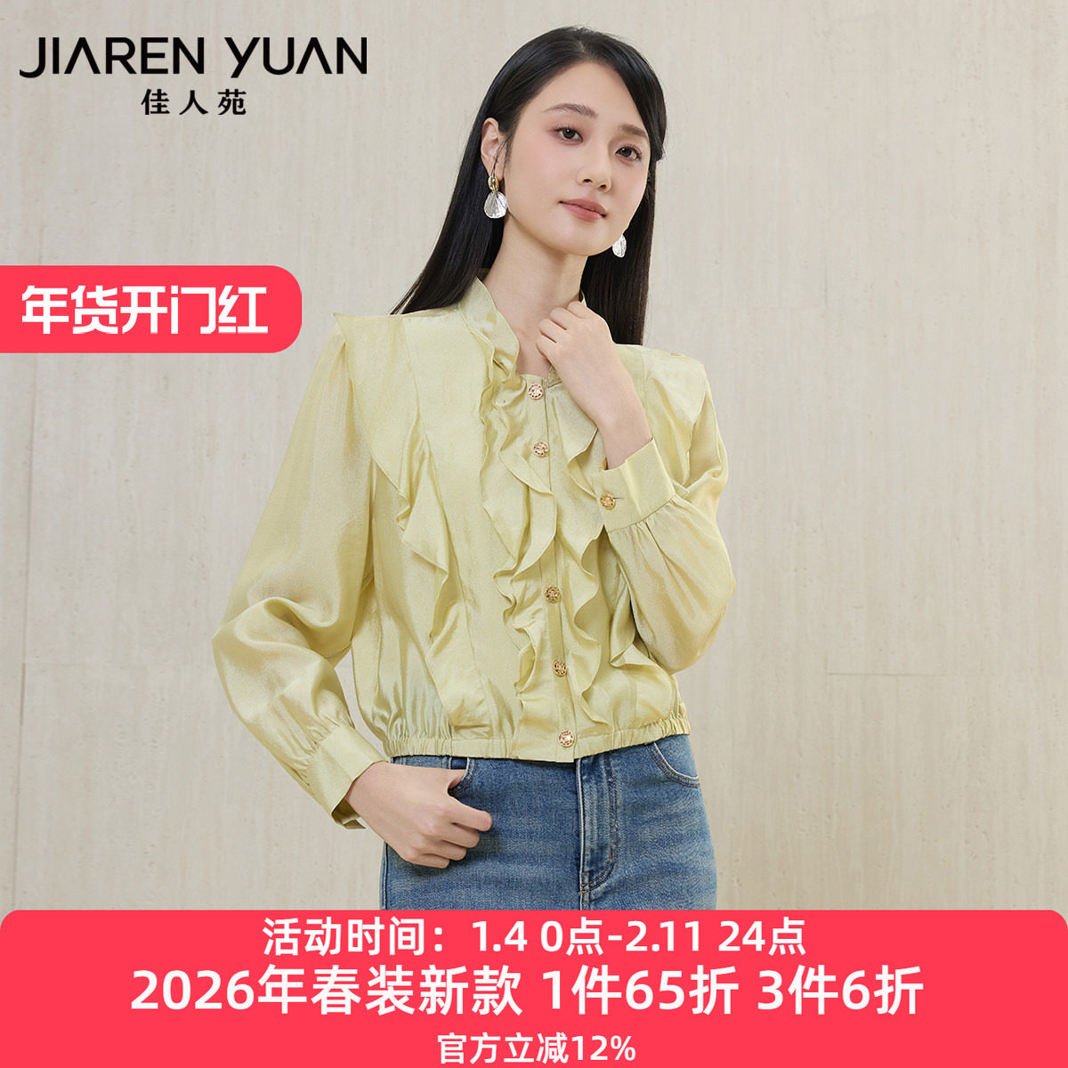 佳人苑雪纺衫女2026年春新款V领荷叶边设计牛津下摆长袖上衣甜美