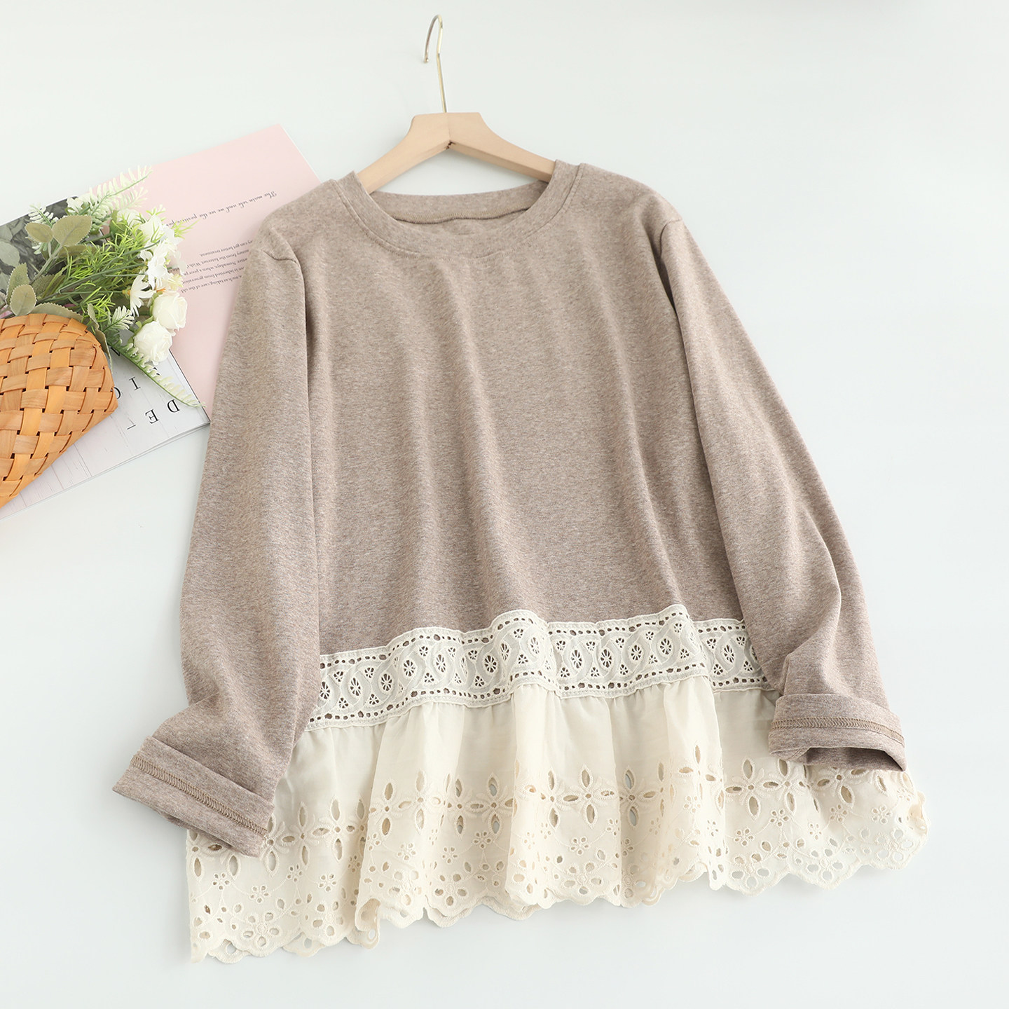 新款森系花边领长袖打底衫女甜美宽松弹力荷叶下摆减龄T恤衫上衣