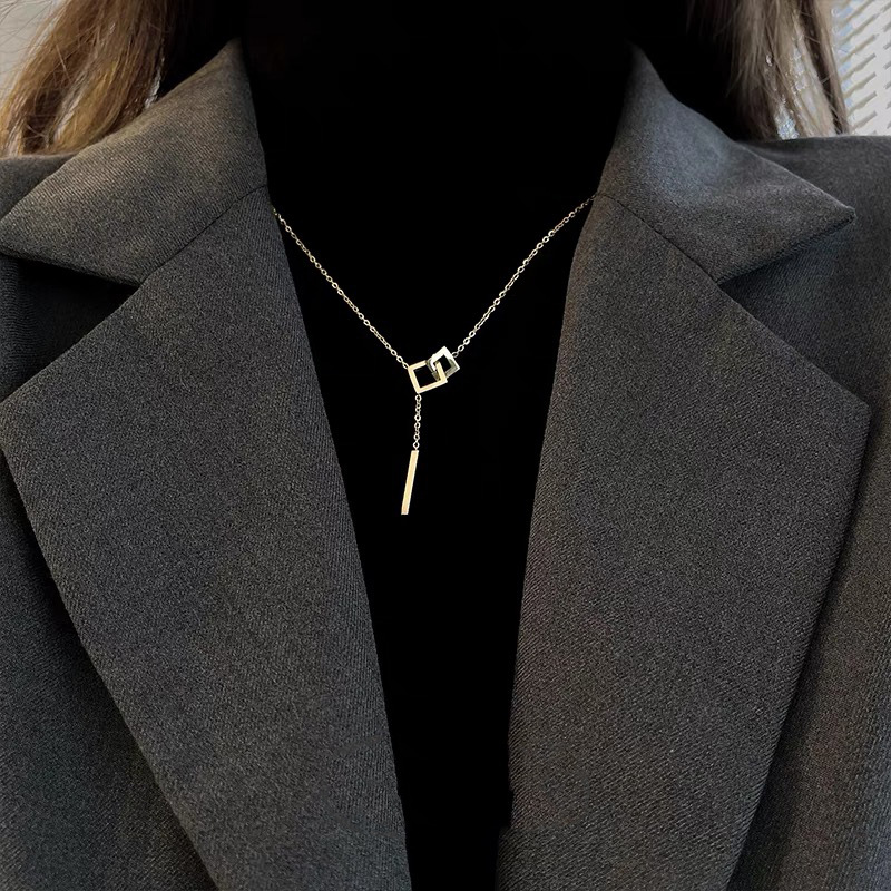 双层叠戴方牌吊坠钛钢长款毛衣链装饰项链女高级感不掉色2025年潮