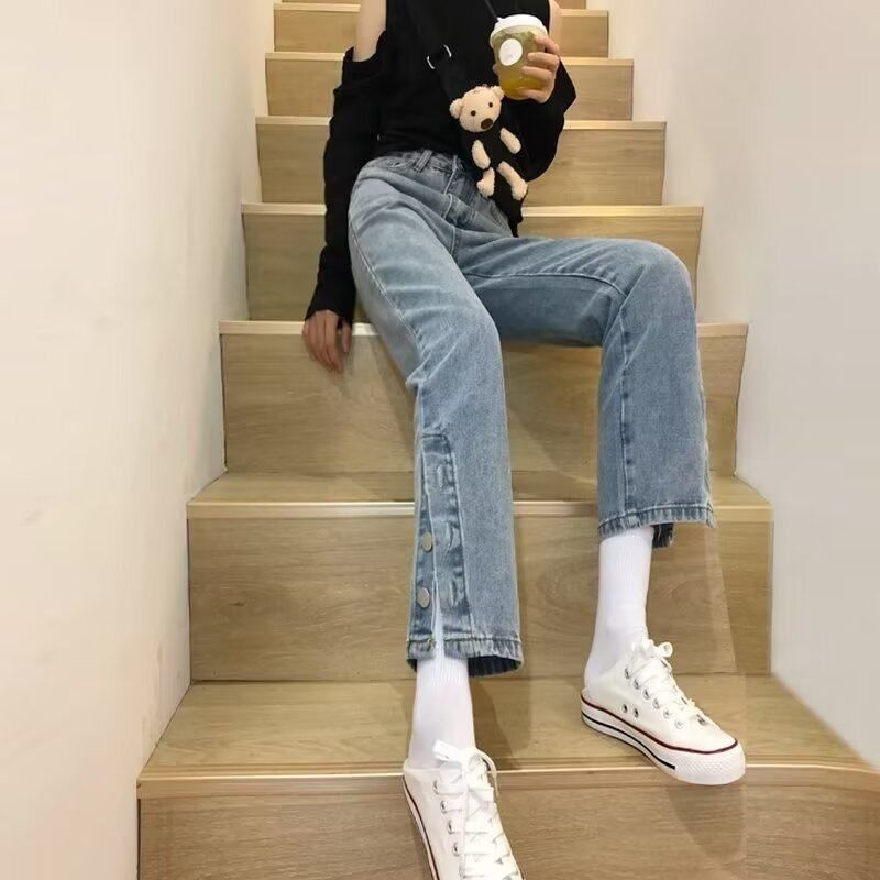 女牛仔裤直筒开叉九分裤显瘦宽松高腰复古潮学生ins韩版百搭春季