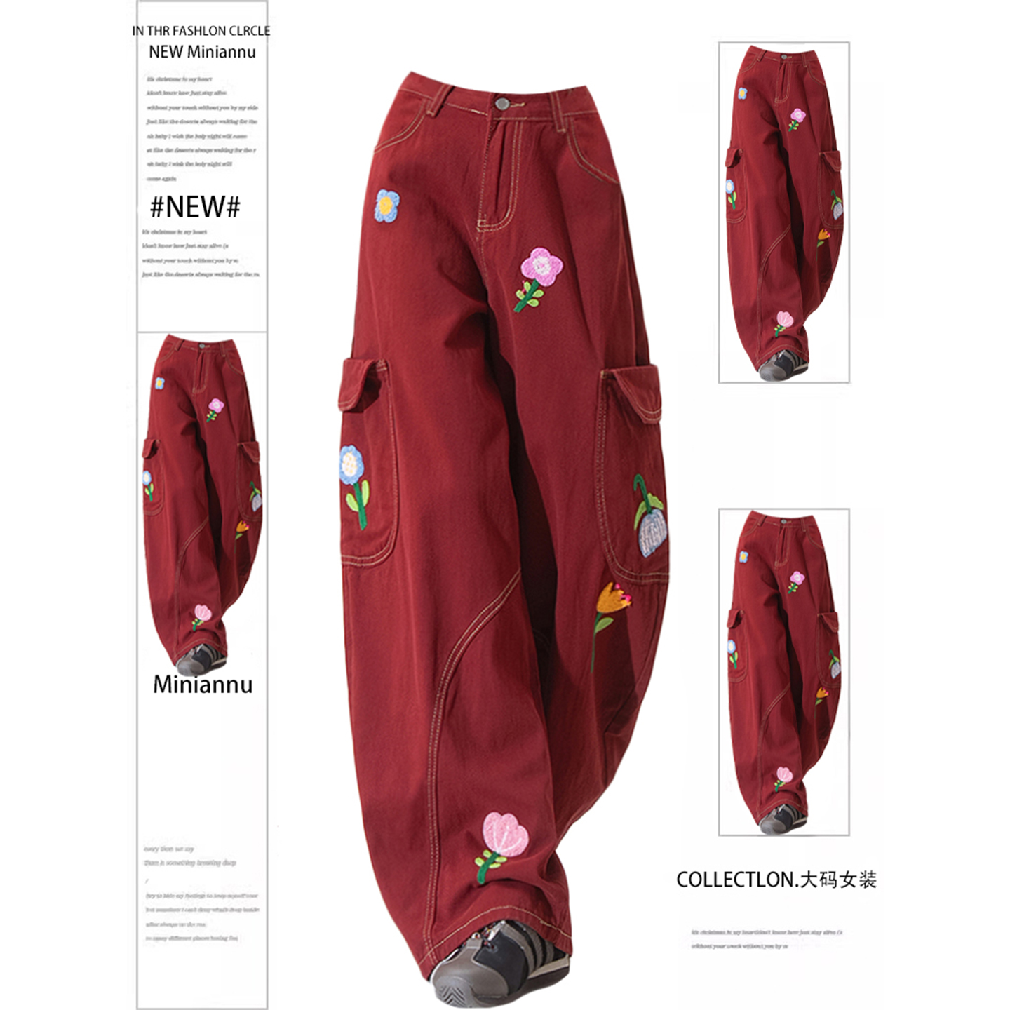 韩版辣妹刺绣牛仔裤女秋季新款学生百搭宽松显瘦高腰垂坠感弯刀裤
