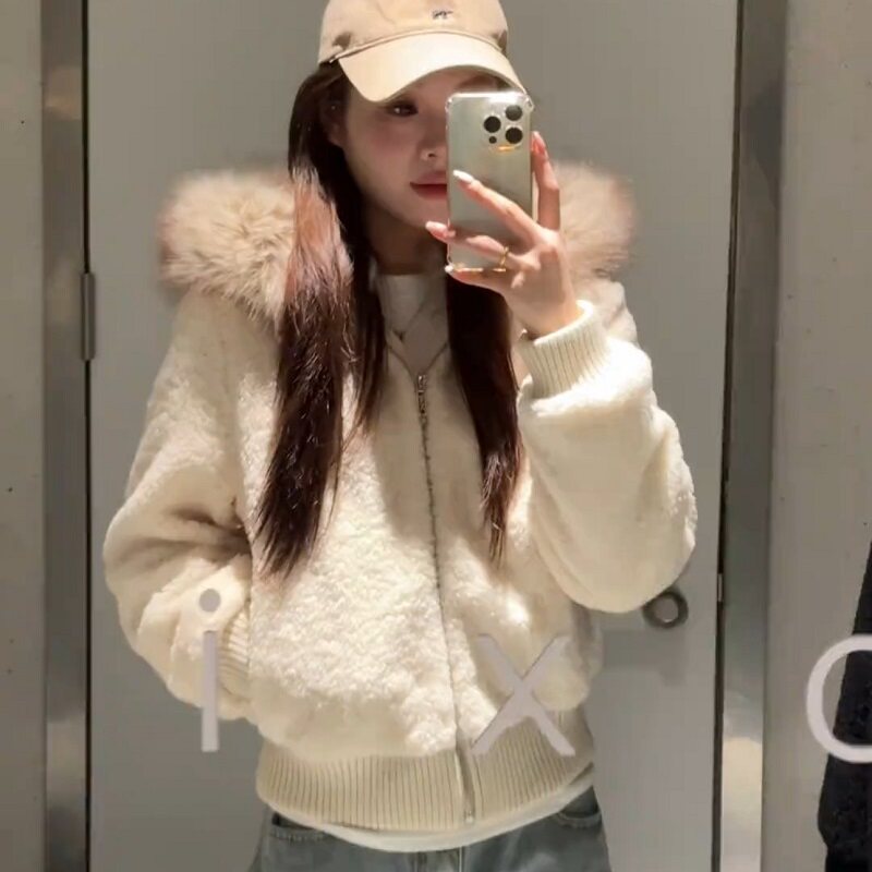 NANGOON 皮毛一体高级感毛毛短外套冬季新款女小个子白色上衣保暖