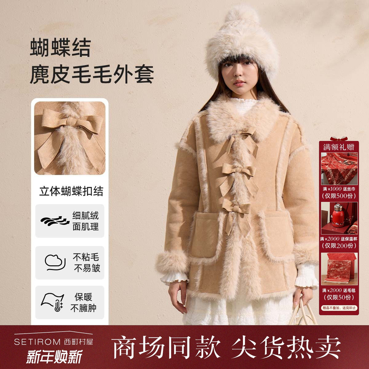 西町村屋毛毛外套女装2025冬季新款舒适蝴蝶结系带上衣XAAD10140