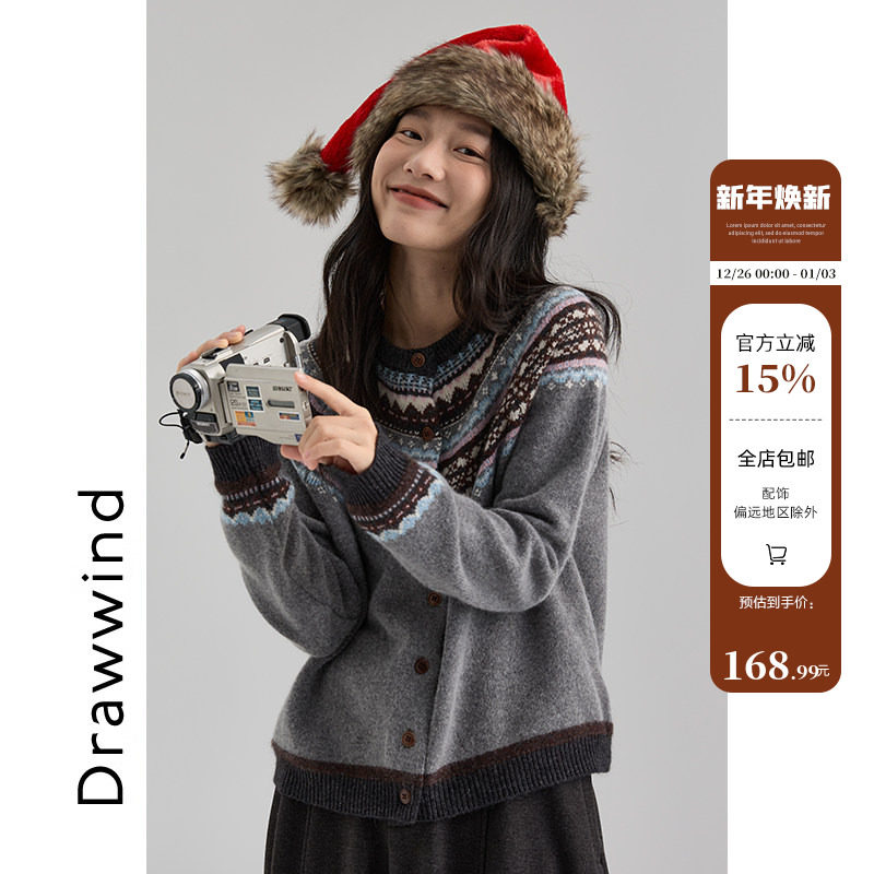 画风drawwind冬季费尔岛提花圆领开衫女复古羊毛毛衣外套2025新款