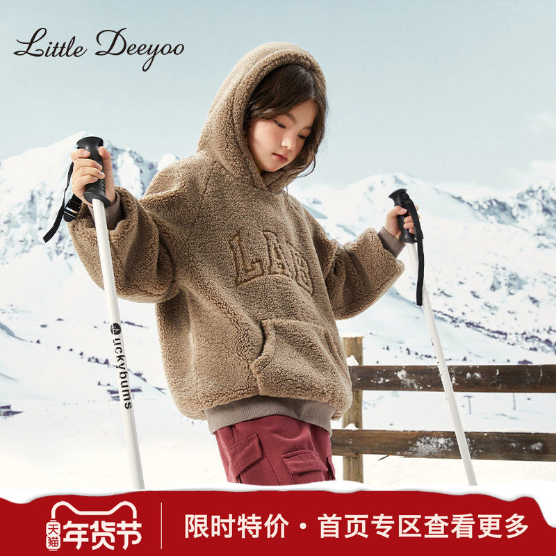 【特价】小叮尤尤女童刺绣仿羊羔毛连帽卫衣中大童加厚颗粒绒抓绒