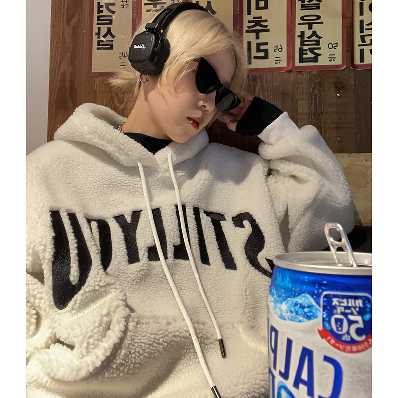 返场STILLYOU百搭学院字母刺绣羊羔毛连帽卫衣男女宽松冬季厚外套