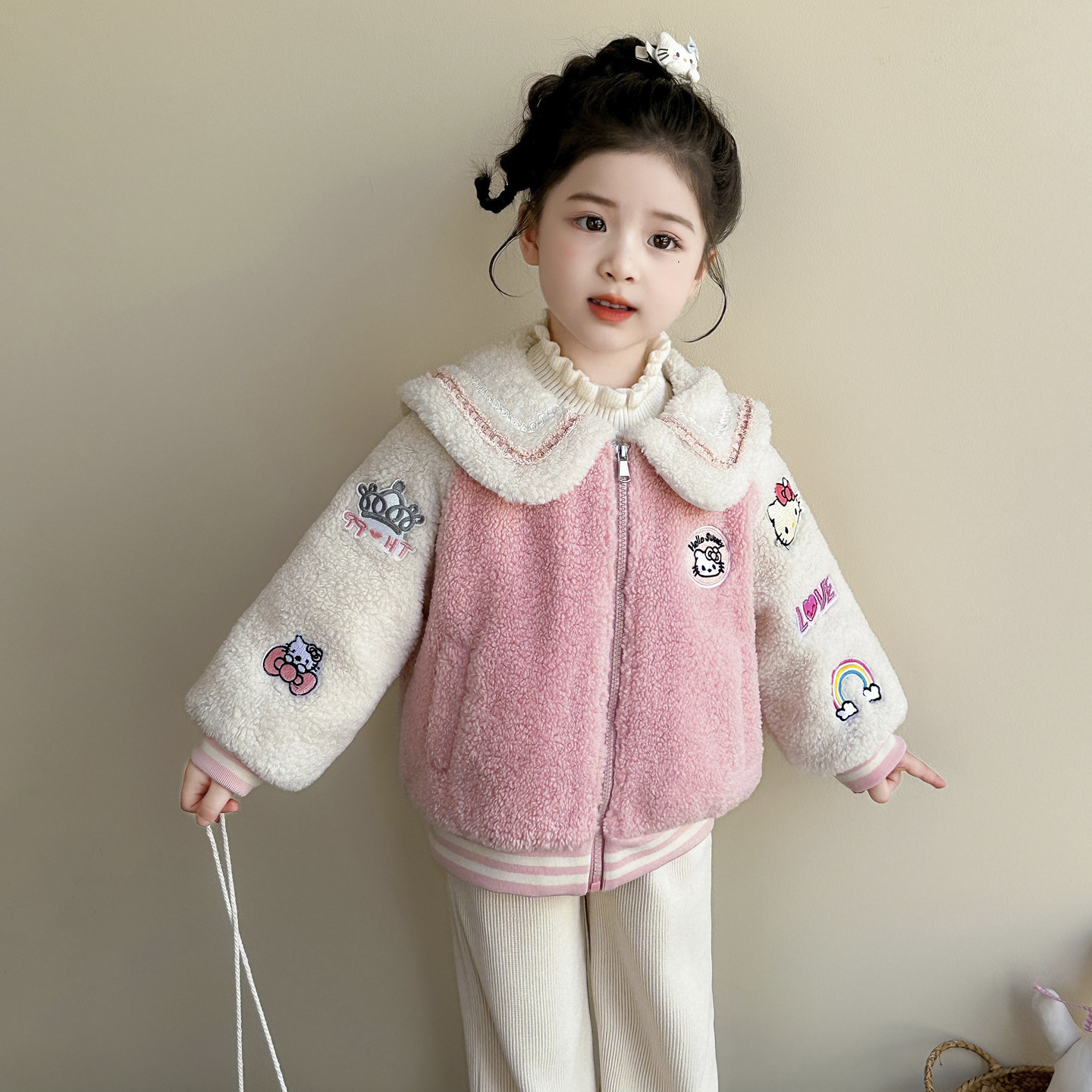 奶fufu羊羔毛刺绣kt猫卫衣外套女秋冬季可爱日系加绒加厚连帽上衣
