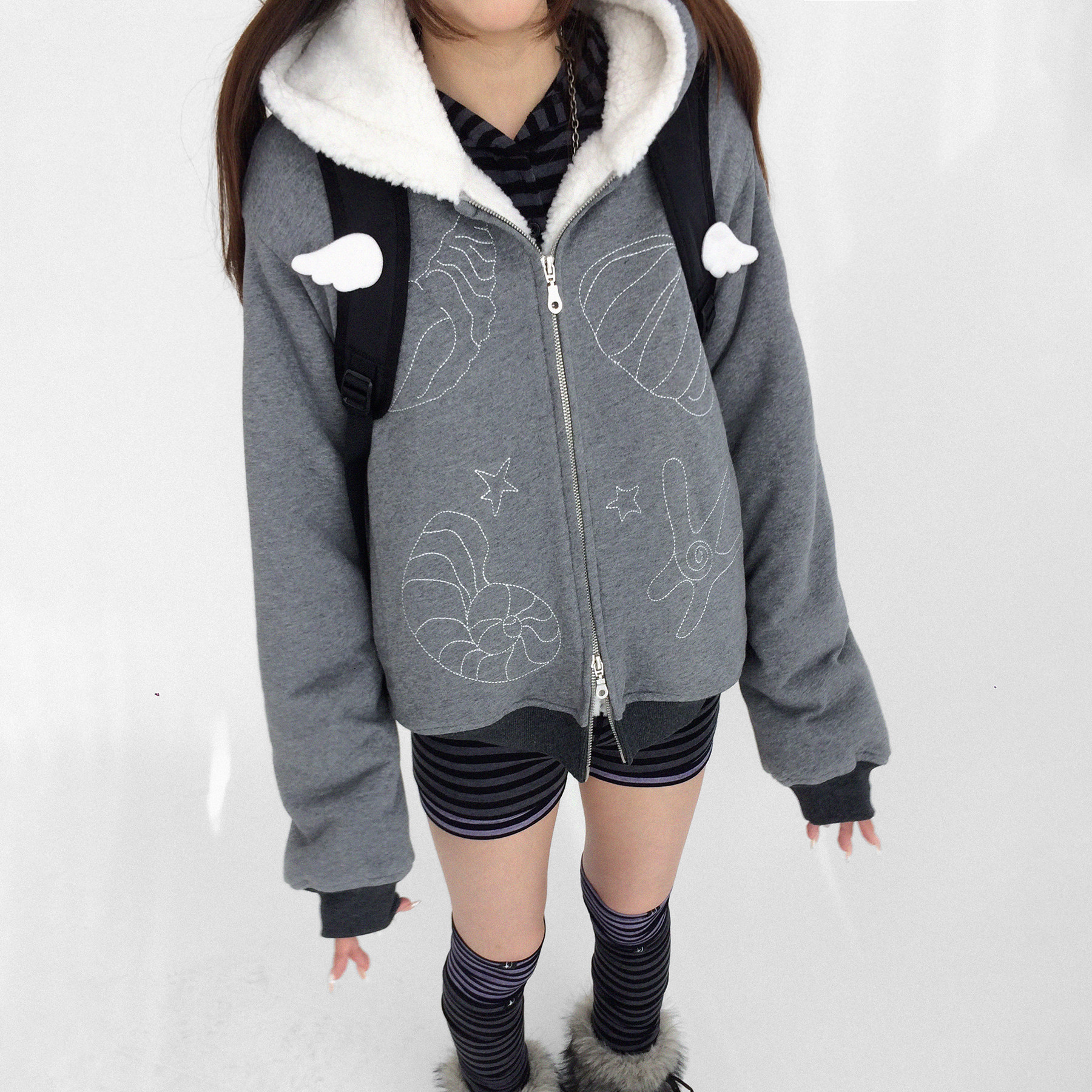 Daisy Bomb 两面穿连帽羊羔毛刺绣卫衣外套宽松休闲加绒保暖夹克