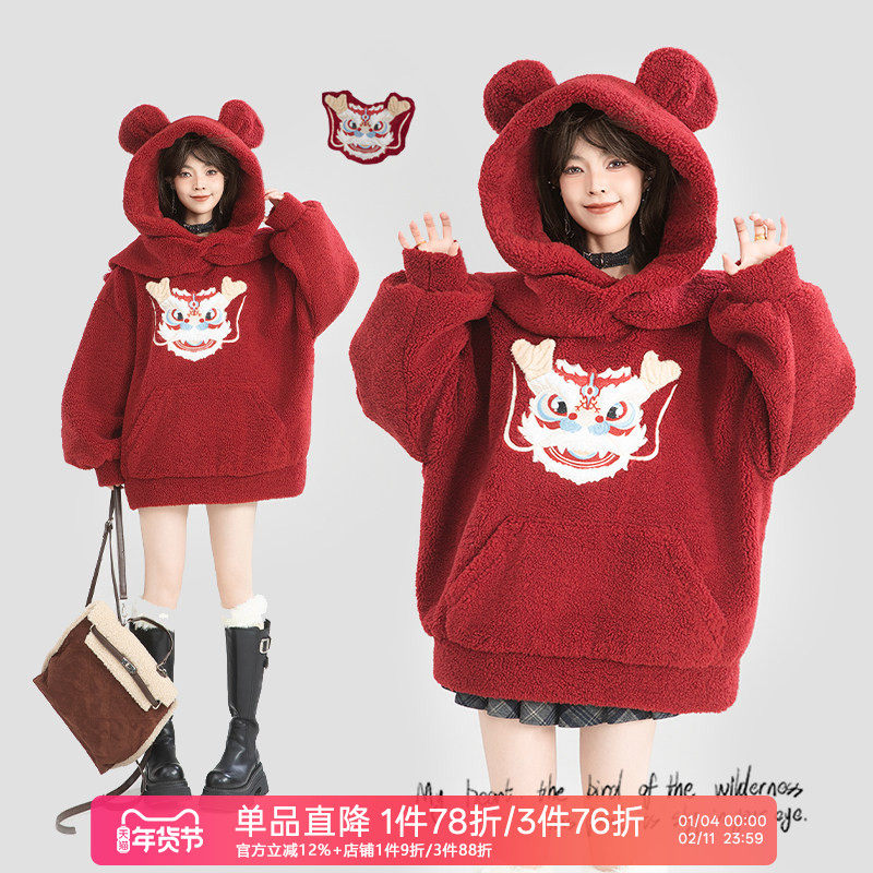 KEIKO 刺绣图案加厚羊羔毛绒外套女冬季围巾领红色连帽卫衣小棉袄