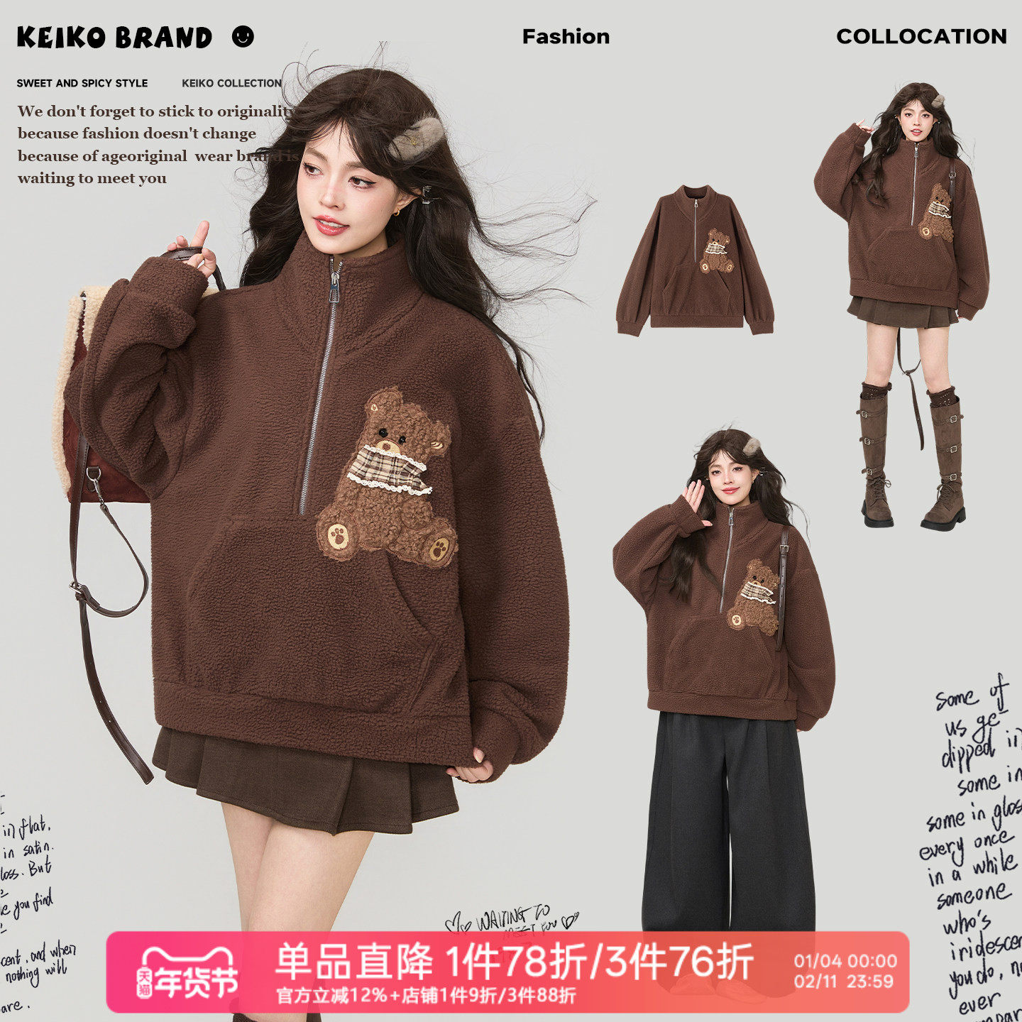 KEIKO 小熊刺绣加厚羊羔毛卫衣冬季半拉链立领宽松摇粒绒外套上衣