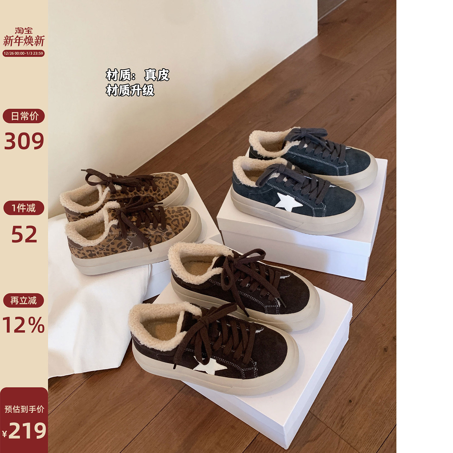 棉鞋女冬季加绒羊羔毛脏脏小脏鞋真皮厚底百搭复古做旧休闲鞋星星