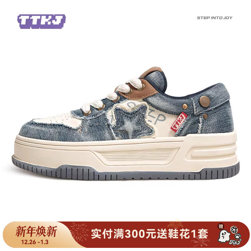 TTKJ鞋子女款牛仔布蓝色帆布鞋秋冬休闲女鞋星星厚底增高运动板鞋