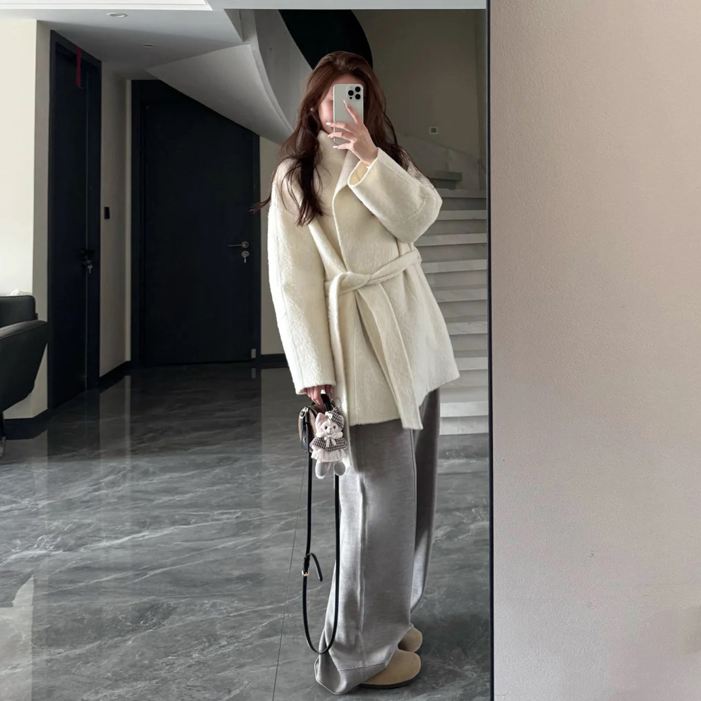 韩系秋冬装温柔风高级感小个子呢子大衣白色显瘦毛呢外套女中长款