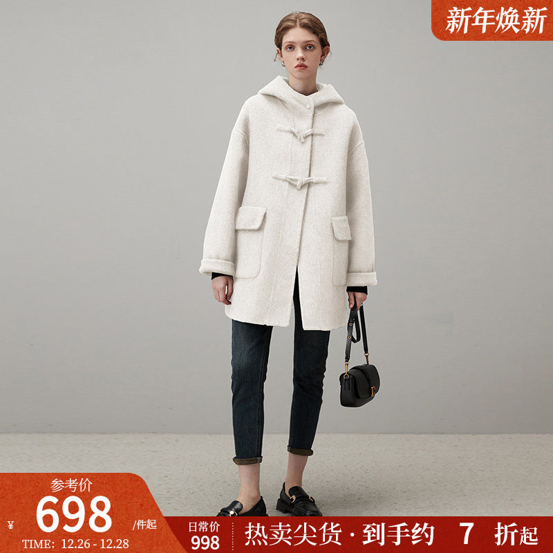 dfvc学院风白色中长款毛呢外套女2025新款连帽中长款双面呢子大衣