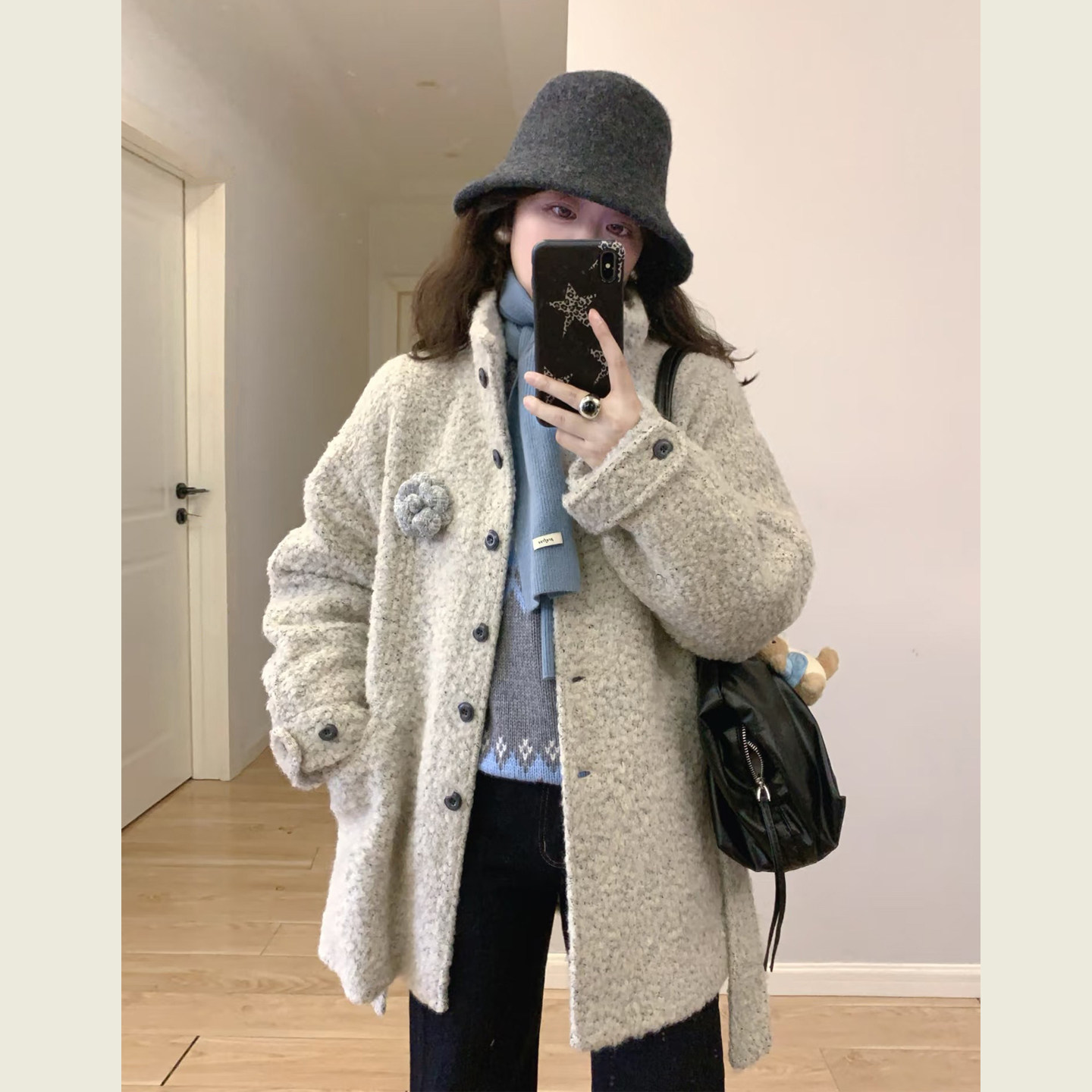 灰白色翻领单排扣圈圈毛呢大衣女秋冬季小个子中长款显瘦呢子外套