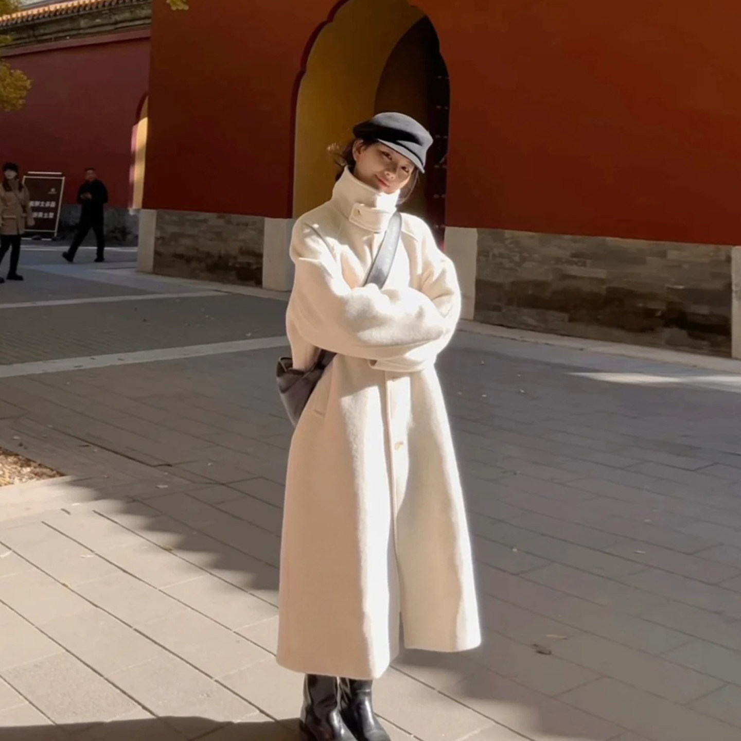 韩系白色斜门襟立领毛呢外套女秋冬季简约气质通勤中长款呢子大衣
