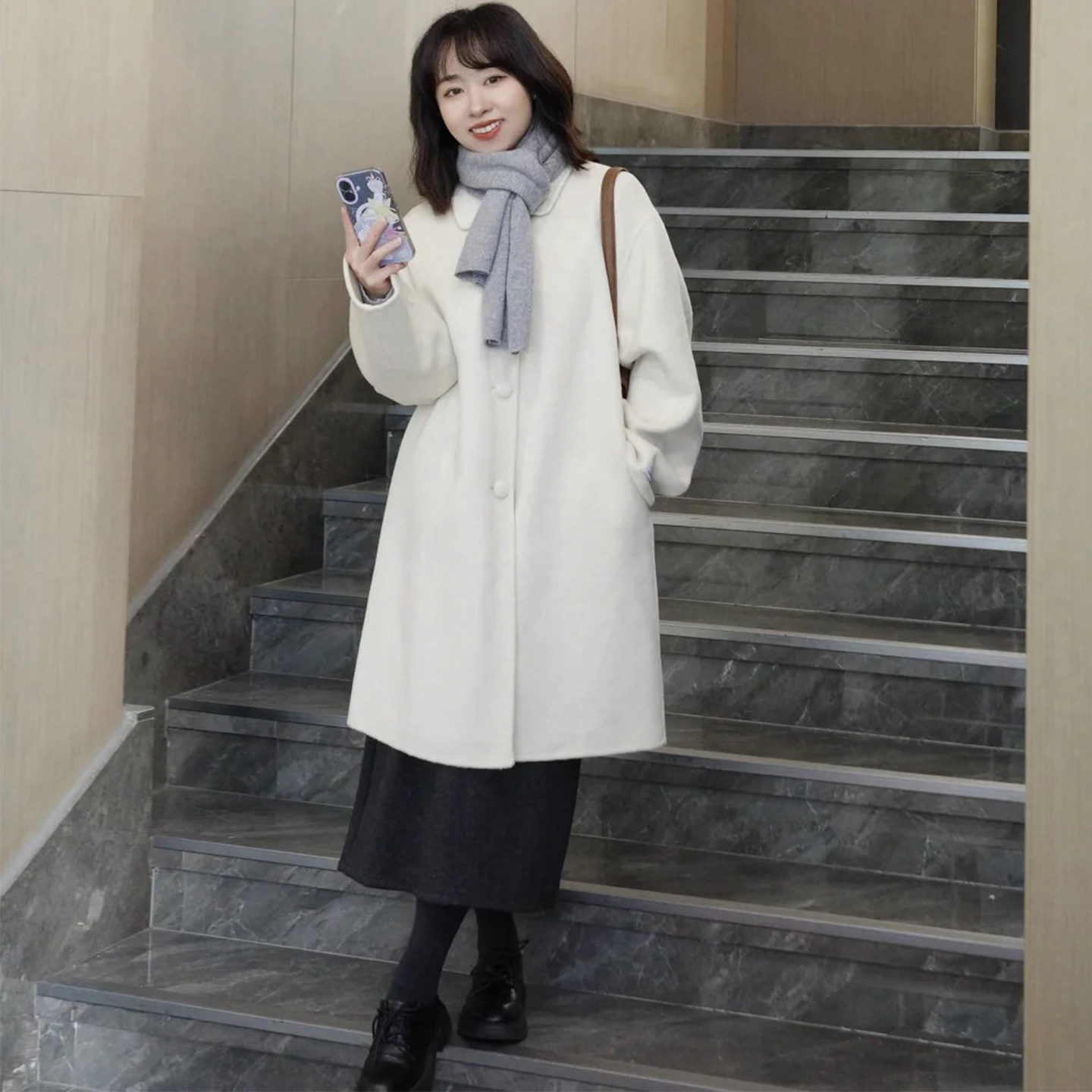 韩系白色翻领单排扣毛呢外套女冬季高级感百搭显瘦中长款呢子大衣