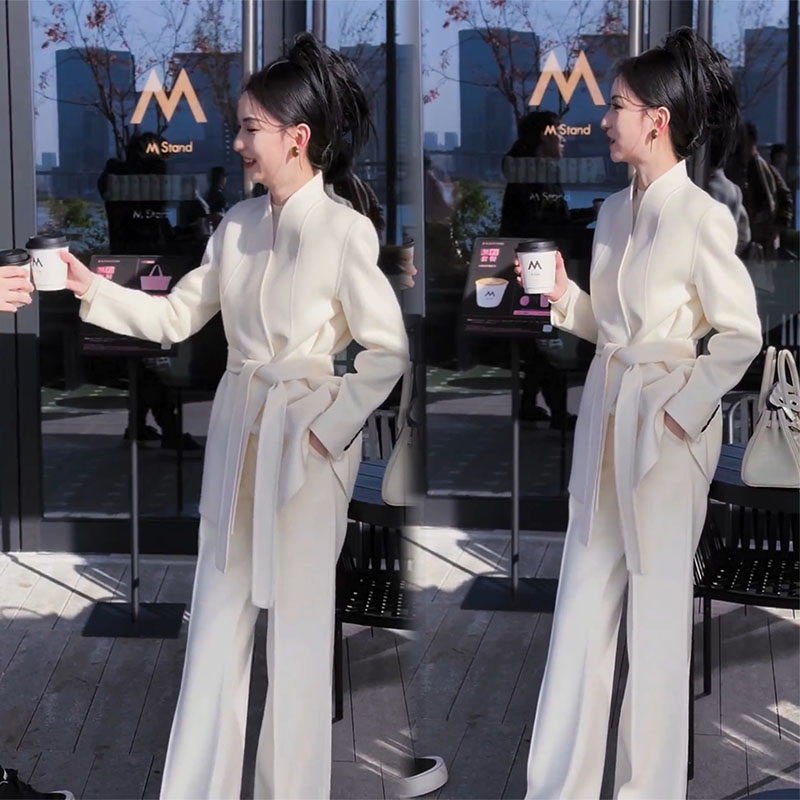 白色系带中长款毛呢外套女秋冬季高级感法式气质收腰显瘦呢子大衣