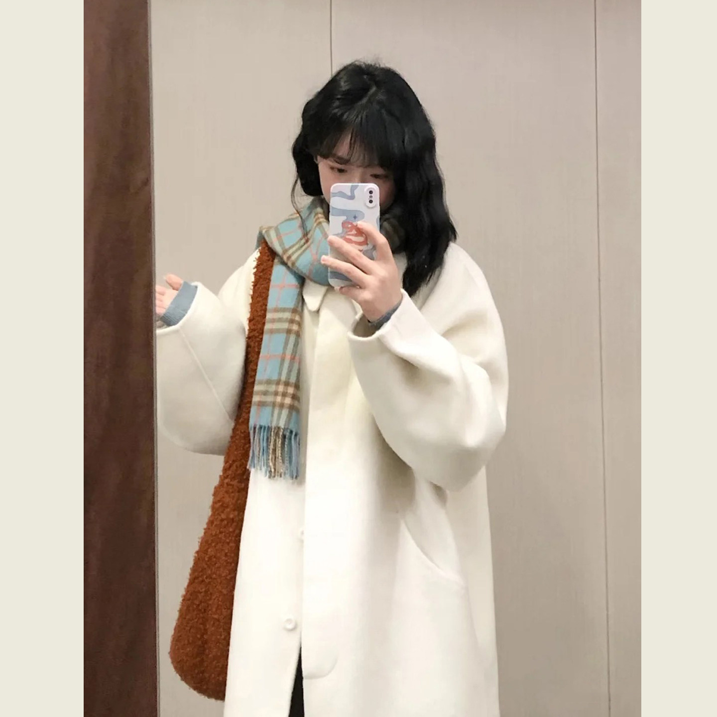 白色翻领单排扣呢子大衣女秋冬季韩系慵懒风小个子中长款毛呢外套
