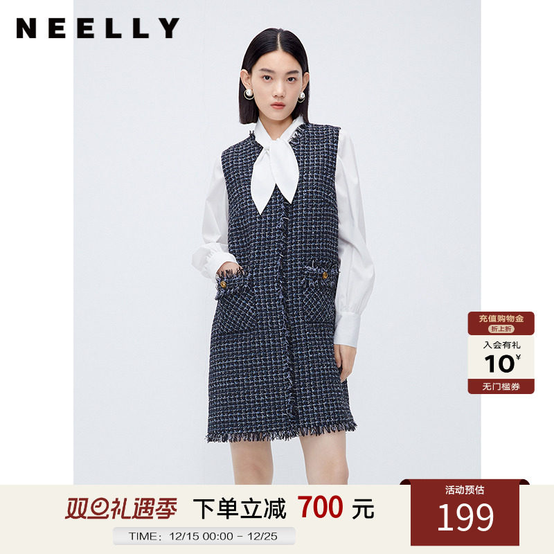 NEELLY纳俪商场同款小香风无袖连衣裙秋冬千鸟格马甲裙显瘦A字裙