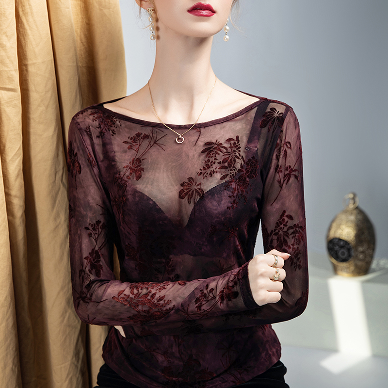 圆领植绒印花打底衫女2025秋季新款内搭洋气小衫网纱透视上衣