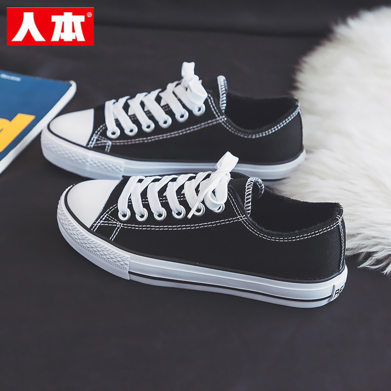 人本经典帆布鞋女秋冬季二棉鞋ulzzang百搭平底学生低帮加绒板鞋