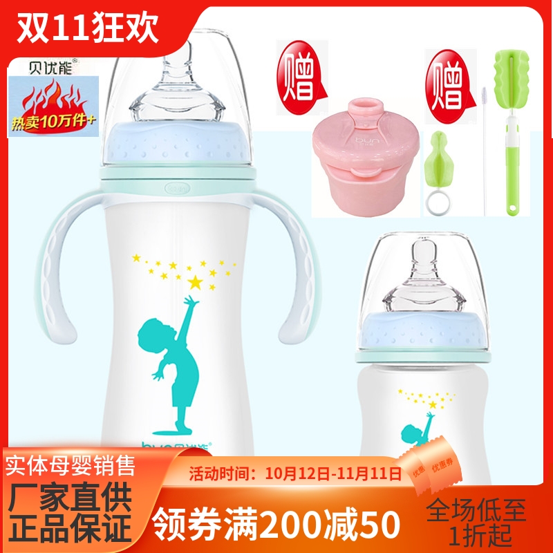 BUN贝优能玻璃奶瓶硅胶喷涂安全防摔宽口径带手柄吸管240ml280ml