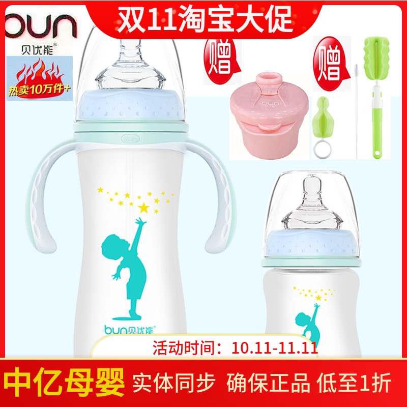 BUN贝优能硅胶套玻璃奶瓶宽口径带手柄吸管防胀气120ml160ml