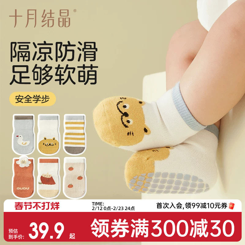 十月结晶婴儿袜地板袜男女童春秋袜子新生宝宝棉袜防滑学步袜3双