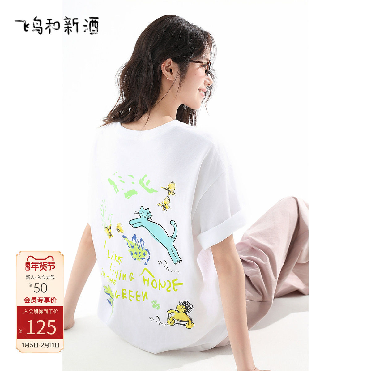 飞鸟和新酒印花纯棉小白T恤女2025夏季新款宽松休闲短袖上衣