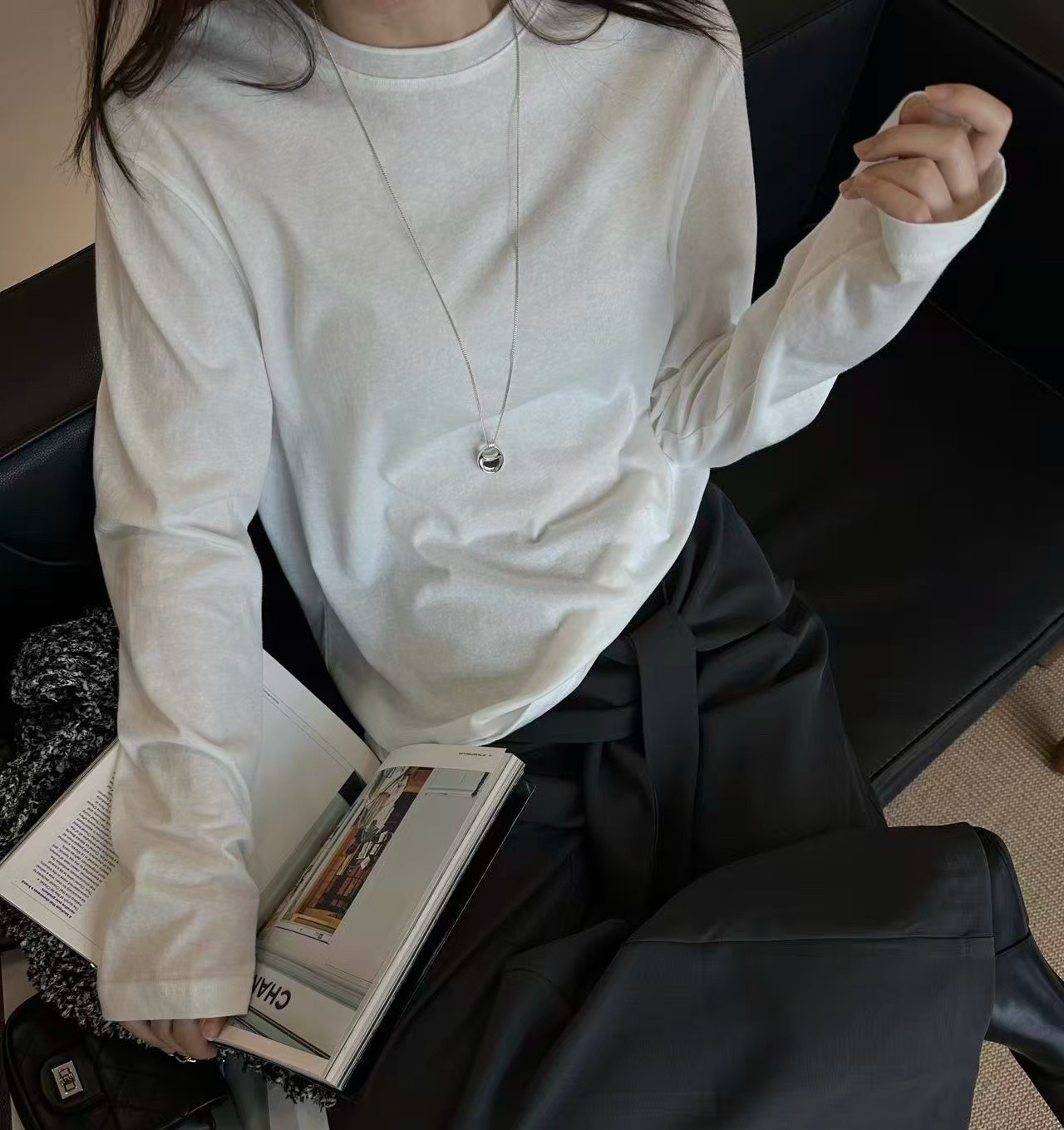 pusumede人手一件 白色圆领针织打底衫女内搭长袖T恤宽松百搭上衣