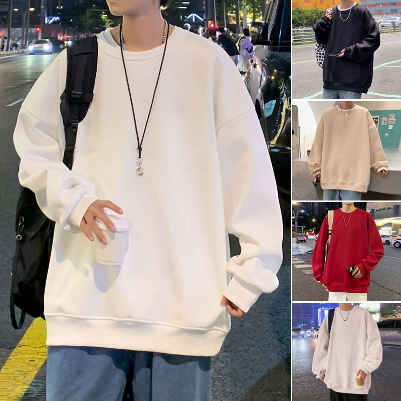 潮牌纯色卫衣男秋冬季港风圆领美式宽松打底内搭长袖ins无帽外套t